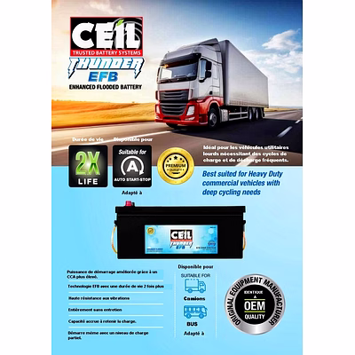 Les batteries automobiles Ceil Thunder EFB utilisent une technologie à électrolyte liquide améliorée, spécialement conçue pour les véhicules équipés d'un système start-stop permettant de réaliser des économies de carburant.