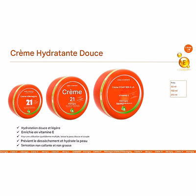 Crème 21, avec des années d’expertise allemande en soins de la peau, possède un puissant mélange de vitamine E et Pro – vitamine B5.