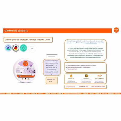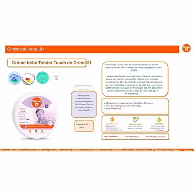 Creme21 Baby s'appuie sur 50 ans d'expertise allemande en soins de la peau pour vous offrir le meilleur des vitamines pour votre bébé.