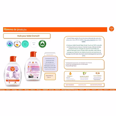 L'huile Creme 21 Baby Tender Touch est une huile hypoallergénique de fabrication allemande, conçue pour les peaux délicates, contenant de la vitamine E, de l'huile d'amande douce et du beurre de karité pour une hydratation longue durée (24 heures).