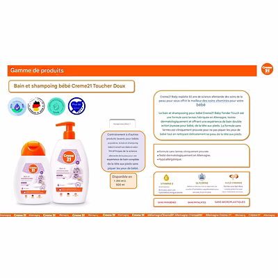 Le bain et shampooing Creme21 Baby Tender Touch, fabriqué en Allemagne, est formulé sans larmes, testé dermatologiquement et offre un moment de plaisir et de bien-être pour le bain complet de bébé.
