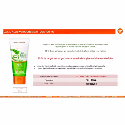 Ce gel est composé à 95 % de gel naturel extrait de la plante d'aloe vera fraîche.
