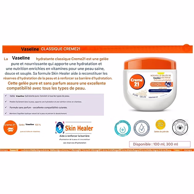 La vaseline hydratante classique Creme21 est une gelée pure et nourrissante qui hydrate et nourrit la peau en profondeur grâce à sa formule enrichie en vitamines.