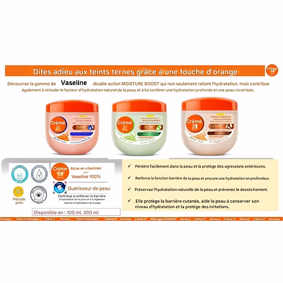 La gelée de vaseline Creme21 Moisture Boost est une crème hydratante intensive à usage quotidien pour les peaux sèches et rugueuses, généralement enrichie en beurre de cacao, vitamine E ou huile d'amande douce, elle forme une barrière protectrice qui retient l'hydratation, répare les gerçures et améliore l'élasticité de la peau.