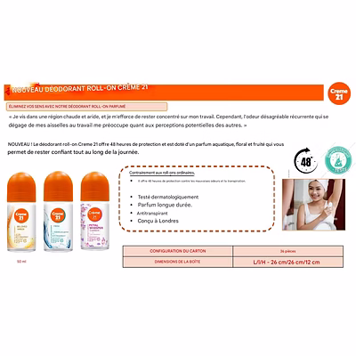Le déodorant roll-on Crème 21 offre 48 heures de protection et possède un parfum aquatique, floral et fruité qui vous assure une confiance en vous tout au long de la journée.